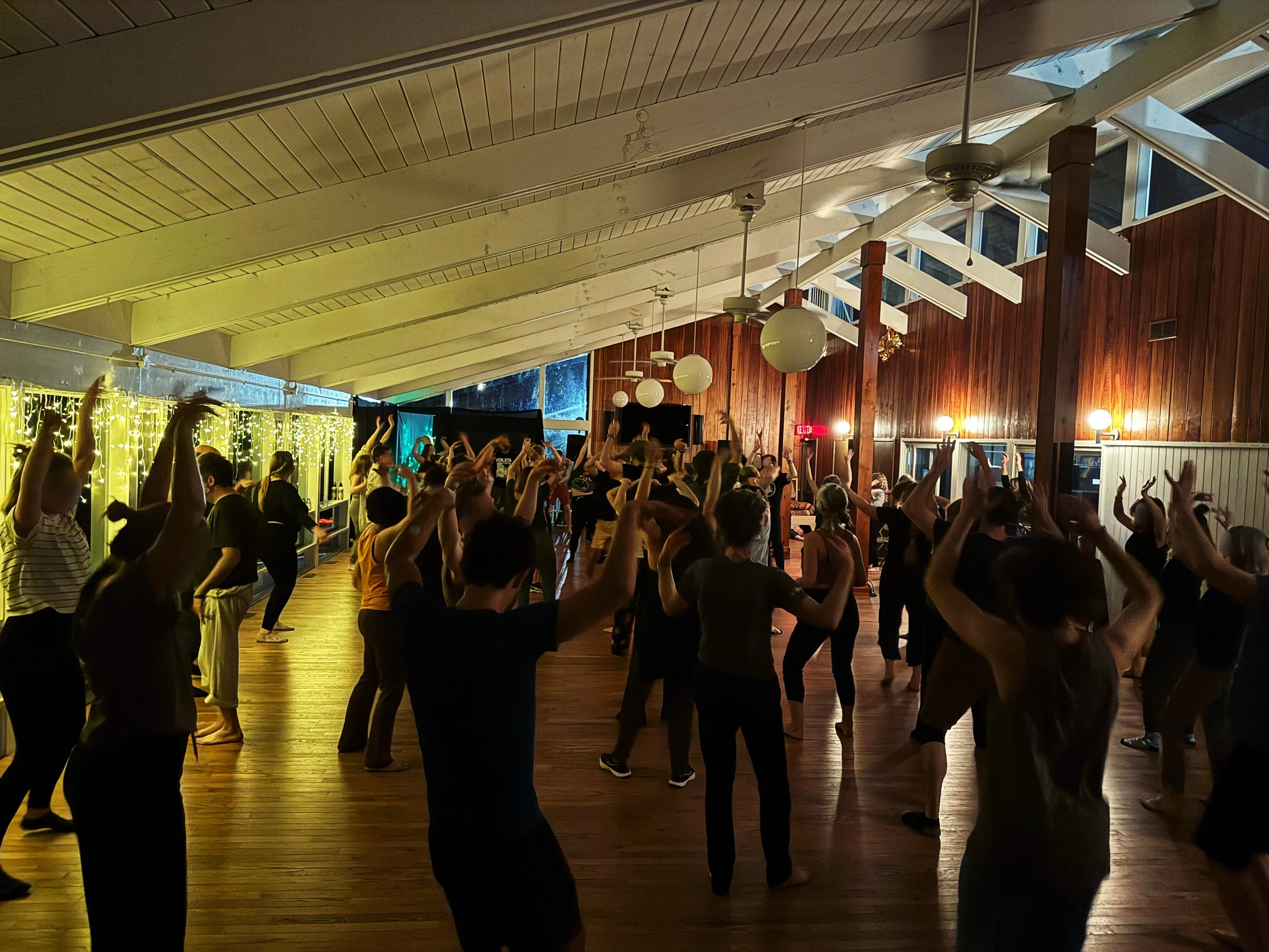 These are movement events above all else, so do expect to move. You may be rolling around on the floor – dress accordingly. Yoga or exercise clothes work great. Bring an extra layer for when things quiet down. Most people dance in bare feet; soft-soled dance shoes or dance paws are recommended if you need foot protection. Dance sneakers are permitted. Other shoes are not allowed on the dance floor. Dance in stocking feet at your own risk! Socks tend to slip on the hardwood floor and for that reason are not considered safe. There are changing rooms if you need them.